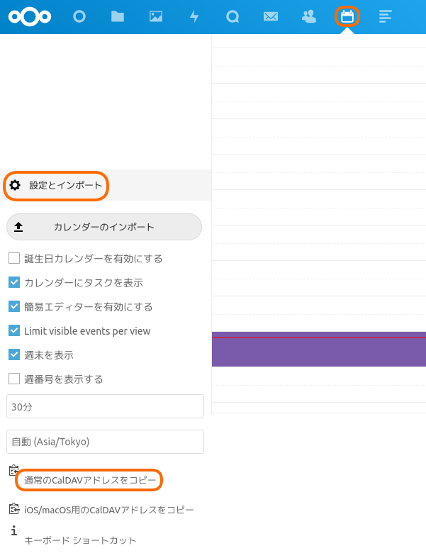 ブラウザからNextcloudにログインした後、カレンダーを選択したところで≡で開くメニューから「設定とインポート」→「通常のCalDAVアドレスをコピー」を選択するとクリップボードにCalDAVのURLがコピーされます。