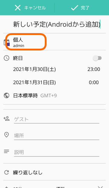 予定を追加してみます。カレンダーは今回作成したDAVx5のカレンダーを選択します。