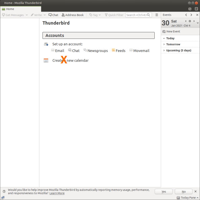 今回はメーラーとしてThunderbirdを使うことはないので、初回起動時のダイアログやカレンダーの作成を全てスキップします。