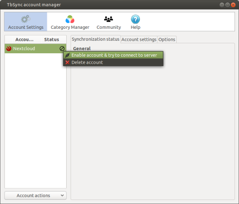 TbSync account managerに戻ってきたら、作成したアカウントを右クリックして「Enable account & try to connect to server」を選択します。
