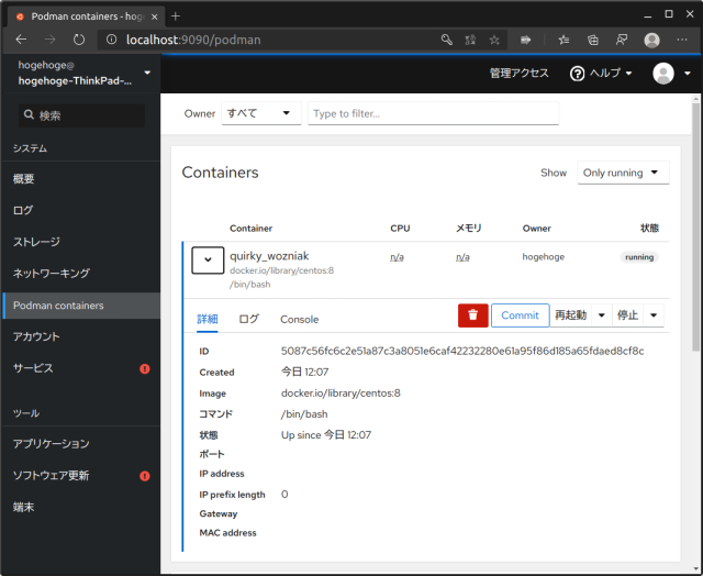 試しに適当にCentOS8のdockerコンテナを引っ張ってきてpodmanで実行したところです。詳細とログとConsoleで参照ができます。