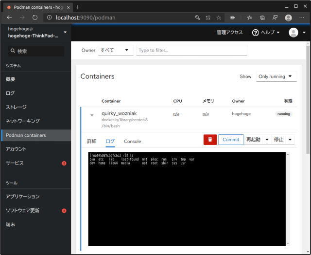 ConsoleはそのままPodmanコンテナにアタッチしてコマンドを実行できます。便利!