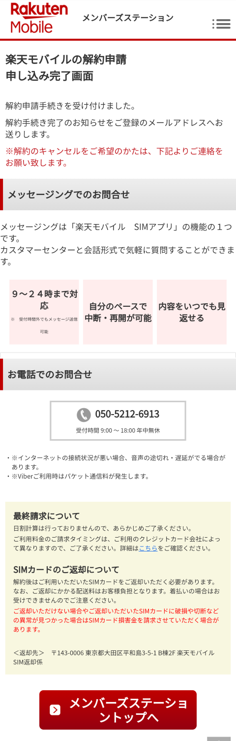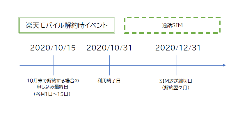 楽天モバイルMVNOの解約は、前月16日~当月15日に解約申し込みをした場合の利用終了日は当月末となります。また、SIMの返却も必要です。