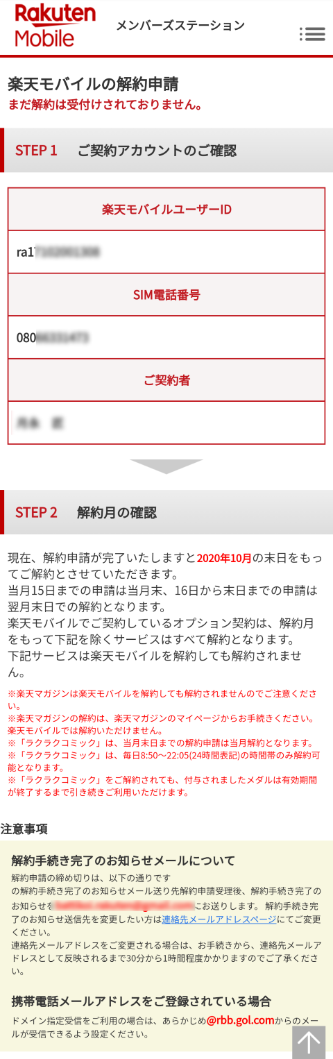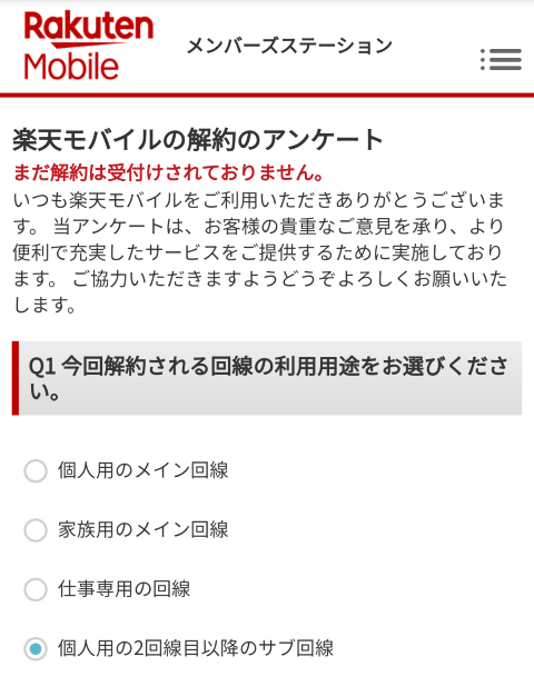解約の最初の作業は携帯電話の解約ではつきものの確認です。楽天モバイルMVNOでは以下の通りとなりました。