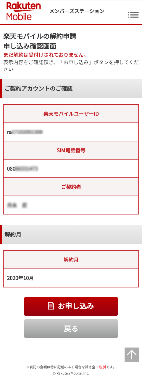 ほぼ同じ内容でもう一回解約申請の申し込み確認画面が表示されます。ここでお申し込みをタップすることで解約の申し込みが完了します。