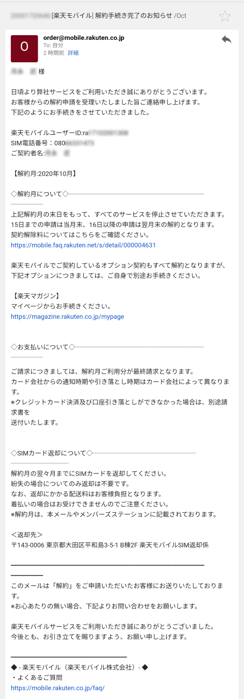 解約申し込みが終わったら、残るはSIMの返却です。FUJI Wifiのように契約終了日の3日後消印有効みたいなことはなく翌々月までなので、忘れずに返却しましょう。宛先は以下となっています。