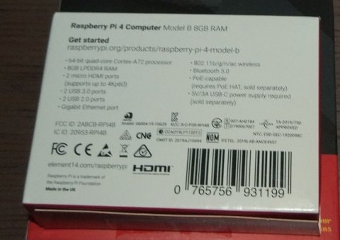 RPi4の外箱の裏面です。バーコードの上にTELECのマークと技術基準適合証明番号が記載されています。