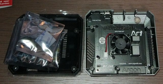 Argon OneにRPi4を入れます。Argon Oneの内容物はこんな感じで、ファンとヒートシンクは最初からケースの蓋部分に付いていて外れない構造になっています。左の袋にライザーボード、ビス、熱伝導シート、ゴム足が入っています。