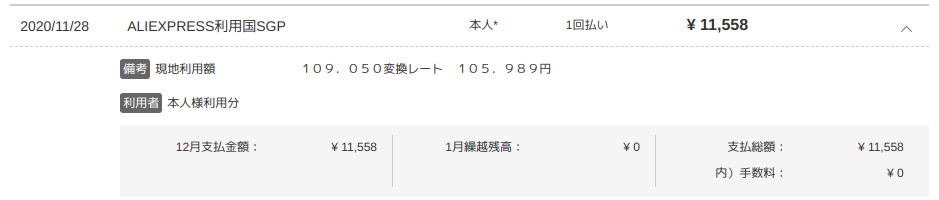 それではAliExpressの精算金額を確かめましょう。支払いはクレジットカード(楽天カード、 Master)です。