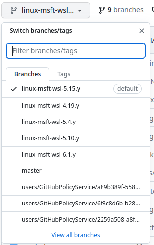 GitHub上のカーネルの5.15.90,1に一番近いものを確認します。今回はlinux-msft-wsl-5.15.yが一番近いので、デフォルトでも大丈夫です。