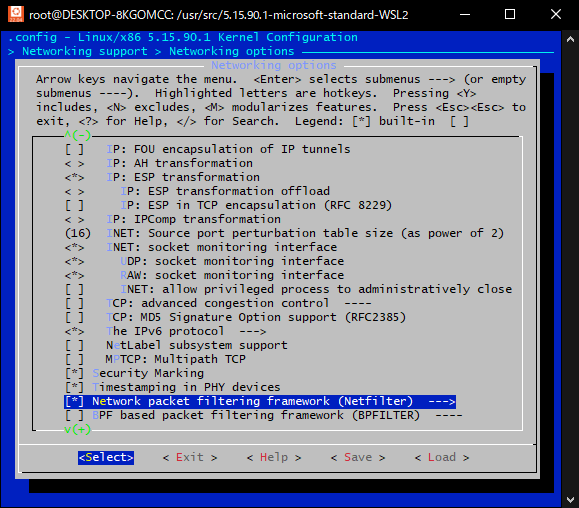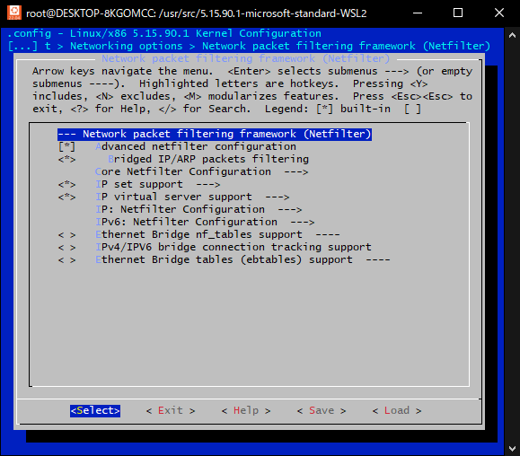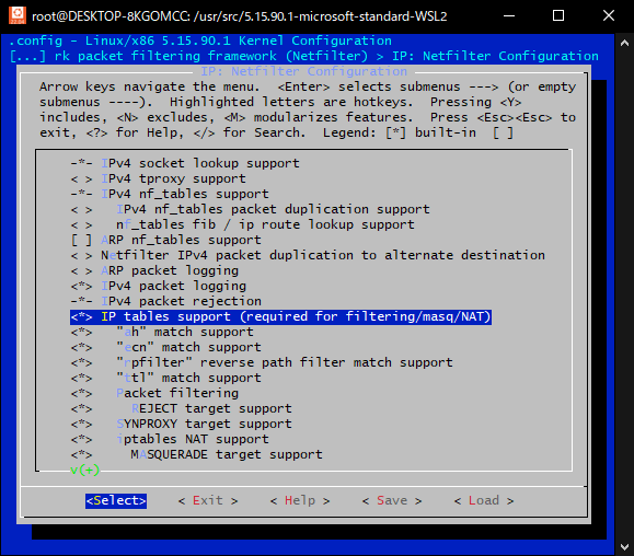 Networking support→Networking options→Network packet filtering framework (Netfilter)→IP: Netfilter Configuration→IP tables support (required for filtering/masq/NAT)をMにしてカーネルモジュールとしてビルドするようにEnterで切り替えるのですが。