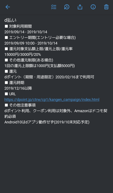 各メモの詳細画面。上部ボタンの右側は左端にチェックリスト作成ボタンがあります。真ん中の共有ボタンはインテントと「共同編集」「公開」「WordPress投稿」があってこの辺りもメモアプリとして使いやすいです。