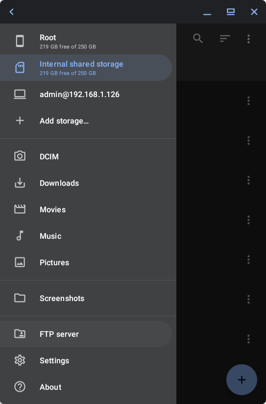Material Filesを起動したら左上の≡から「Add storage…」「FTP server」をタップしてFTPサーバーを追加します。