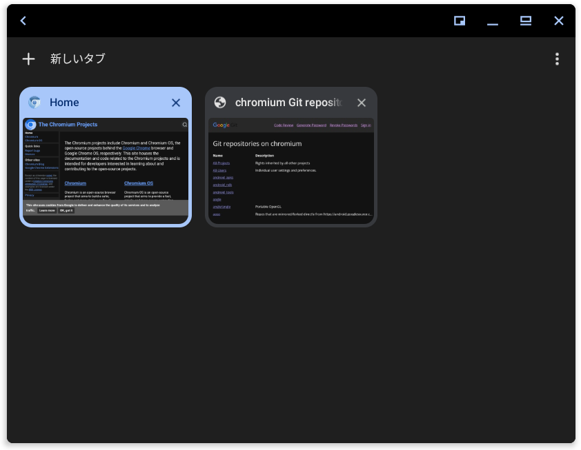 但し、レンダリング部分は表示が真っ黒なだけでタブ一覧画面を出すと縮小して表示されるため、Waydroidの描画の仕方がSkiaとあってないんじゃないかなという感触を受けます。バグとして上がっているので対応を待ちたいところです。
