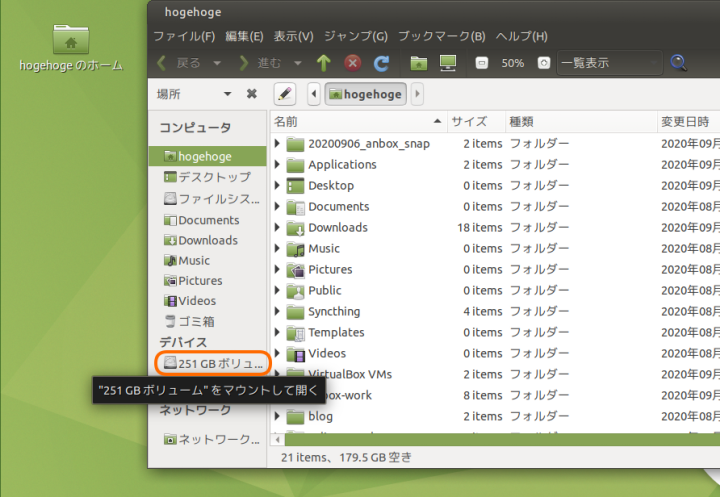 Caja(MATEのファイルマネージャ)を開くとデバイスにパーティションが表示されているので、クリックします。